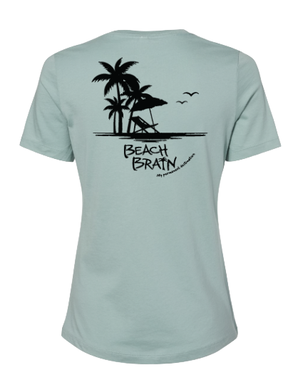 Our new Sun-Kissed Ladies’ Tank features a relaxed fit, flowy bottom. It’s for you ladies that prefer to “let it all hang out”. Hey, why not? Hopefully you’re at the beach! Because the tank is “sun-kissed”, it’s already got a faded look, but don’t worry about our logo being lost. “Beach Brain” is on the back! (And we think that’s a good thing.) We have updated this tank with a simple palm tree on the front. The Tank is a 65/35 poly/cotton blend and, like pretty much all our shirts, it’s super-soft and comfy. You’ll be surprised at how easily you forget you’re wearing it! The tank currently comes in Ocean Haze. This is a GREAT beach tank & Vneck. (Ladies sizing)