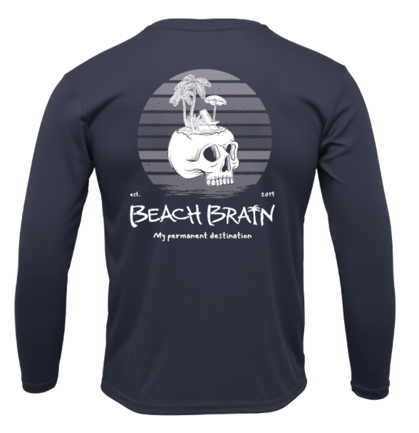 Protect your skin and rep your coast in the Beach Brain Skull Performance Long Sleeve. Designed with our signature skull logo and “My permanent destination” print, this shirt blends style, comfort, and protection — perfect for life on and off the water.
