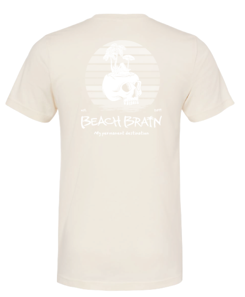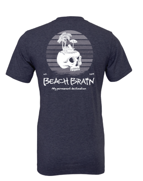 Beach Brain Skull T. We all love a traditional t-shirt! Especially when it showcases your Beach Brain! Now offered in a Heather Navy & Heather Neutral! Our dual blend t-shirt is 52% air lume combed polyester, 48% ringspun cotton, and 100% perfect t-shirt for any occasion. Combed and ring-spun cotton basically means that the cotton fibers are spun then combed through to remove impurities while ensuring it keeps that soft feel. That’s interesting. The fabric has been laundered in advance to reduce any additional shrinkage. The shirts are machine washable, but please handle with care.